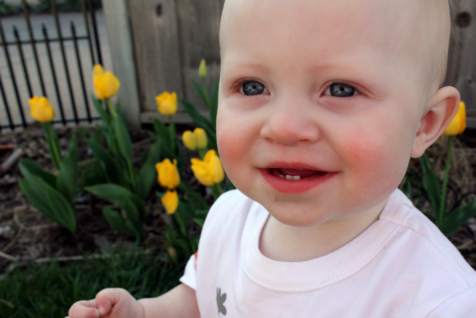I love spring. Everything is in bloom and beautiful. The pear trees are amazing right now! Daffodils have already bloomed and are starting to wane. But now the tulips are starting to bloom! We don't have any tulips planted in our yard... maybe next year. So this year we "borrowed" our neighbor's tulips and took a few pics of the kid with the tulips. He wasn't really in much of a mood to allow photos, so these aren't as great as I had hoped...