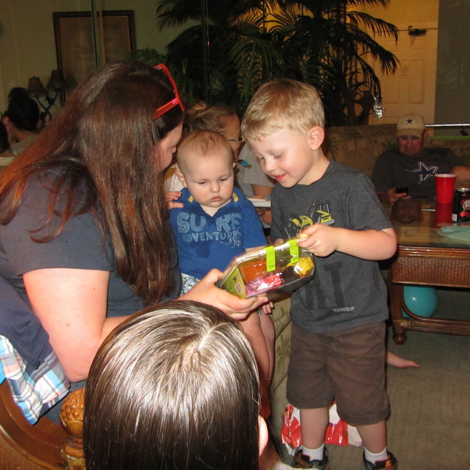 For Locke's FIRST BIRTHDAY celebration, we had a big party. We grilled hamburgers and hot dogs and invited the Lewis and Shober clans to our condo. We even baked Locke a birthday cake with blue frosting and fish sprinkles -- we were celebrating at the ocean, afterall! He loved smashing the cake and frosting all over his face and all over his Mommy too. He opened presents from his family and then was ready for bed after a long, fun-filled day. I can't believe my little baby is already one year old.
